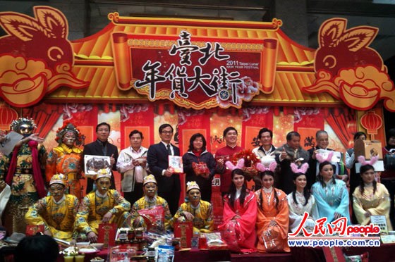 台北市年货大街将于1月15日热闹开卖。12日,台北市政府与六大商圈共同举行记者会,提出“价格公道”、“货源充足”、“亲子同乐”、“安全无虞”和“满载而归”五大保证,并展示丰富多彩的“好康(又好又便宜)”年货商品。图为台北市长郝龙斌与各大商圈代表展示特色年货。