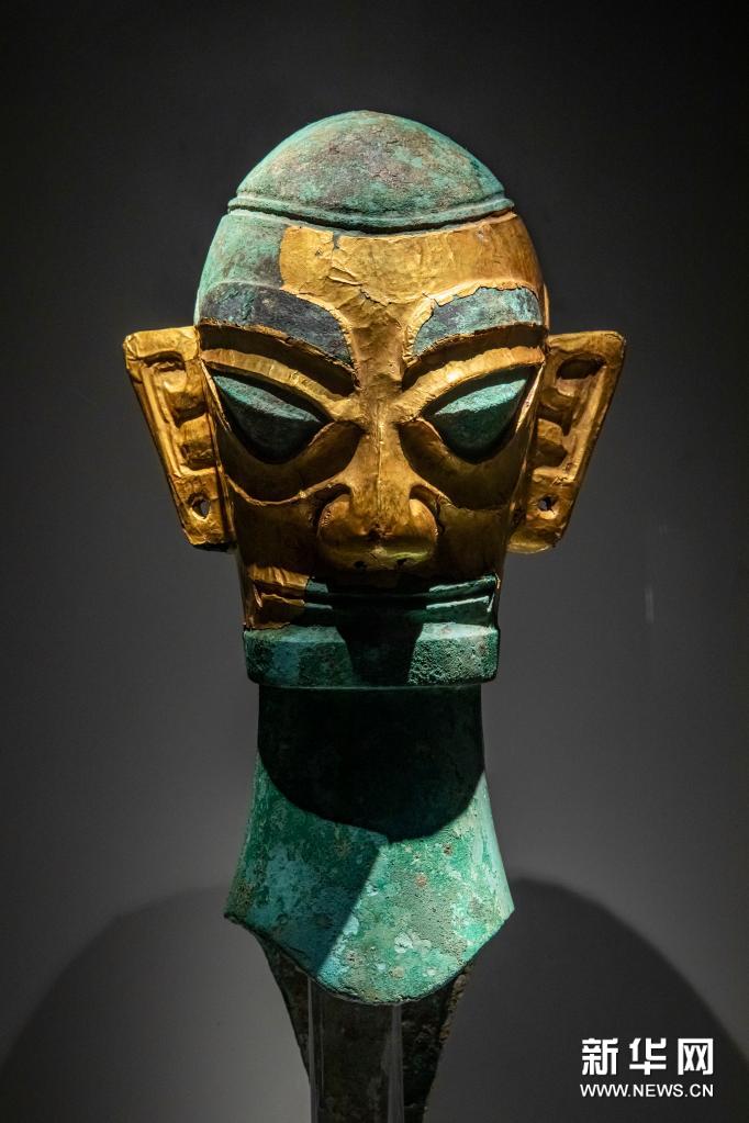 这是在位于四川省广汉市的三星堆博物馆拍摄的1986年出土于三星堆2号“祭祀坑”的戴金面罩青铜人头像(3月5日摄)。新华社记者 沈伯韩 摄