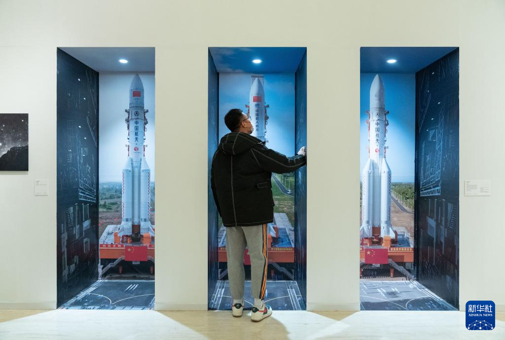 12月28日,在北京首都博物馆举行的第四届全国青年摄影大展上,观众观看摄影师史啸的作品《长征五号出征》。