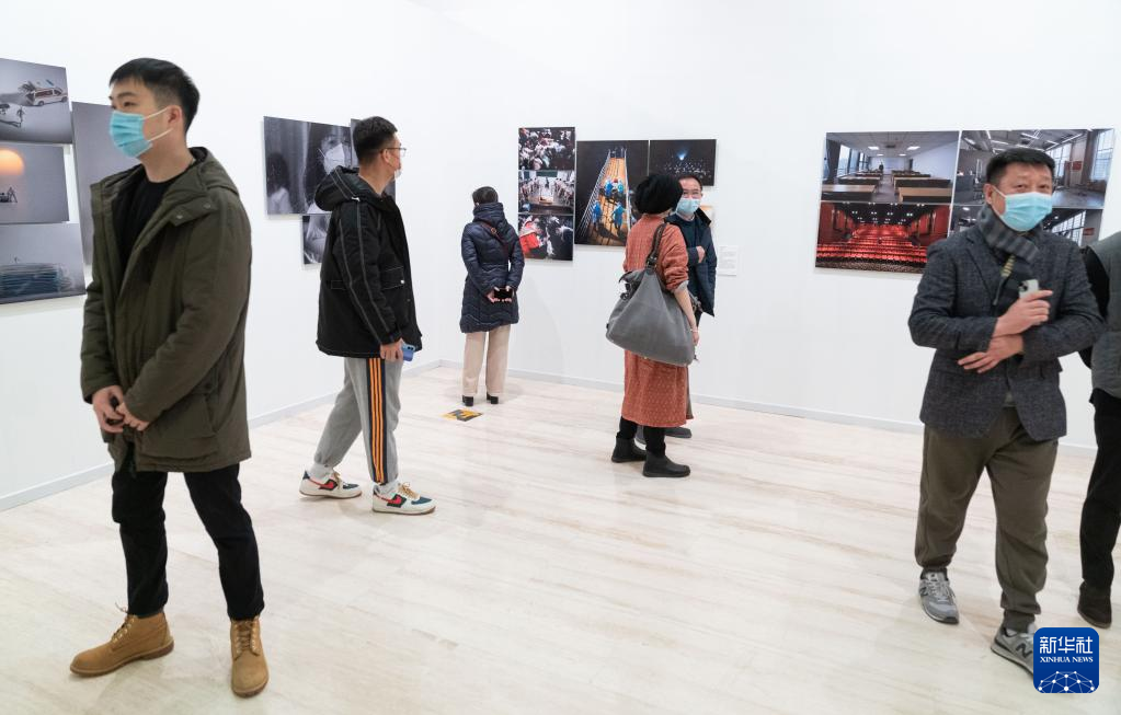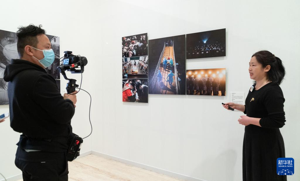 12月28日,在北京首都博物馆举行的第四届全国青年摄影大展上,工作人员在线直播介绍新华社记者肖艺九的摄影作品。