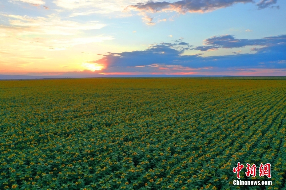 每年7月中旬至8月上中旬,阿勒泰地区的向日葵竞相开放,形成一片片金色花海,波澜壮阔、唯美梦幻。图为新疆阿勒泰,福海县黄花沟大片向日葵盛开。