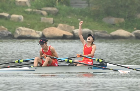 2023年9月24日,在杭州亚运会赛艇女子轻量级双人双桨决赛中,中国组合邹佳琪/邱秀萍夺得冠军。新华社记者 江汉 摄