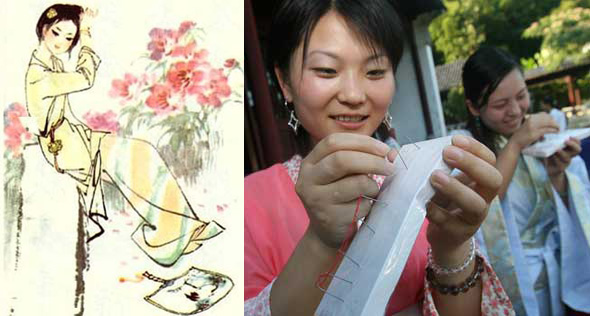 七夕的习俗多种多样,大致有:穿针乞巧、喜蛛应巧、投针验巧、种生求子、为牛庆生、晒书晒衣、 供奉“磨喝乐”、 拜织女、拜魁星、吃巧果、七姐诞、染指甲、 妇女洗发、结扎巧姑、 拜“七娘妈”。