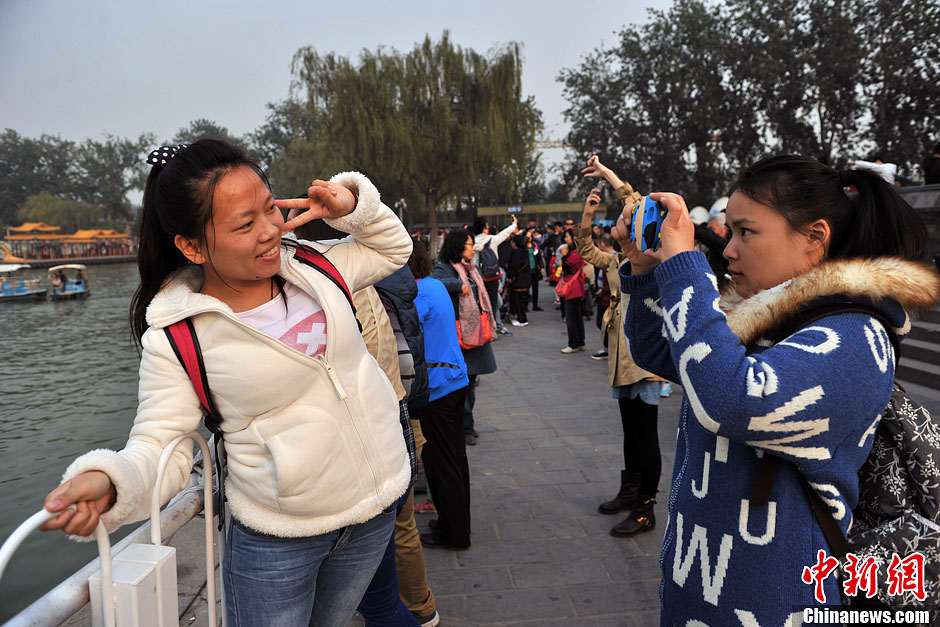 10月27日,北京颐和园岸边人头攒动、观者如潮,不少游客全家出动前来合影留念,跟“鸭”说再见。当日,大黄鸭将结束北京之旅,踏上新旅途。颐和园昆明湖上游船穿梭,中外游客纷纷在“大黄鸭”即将告别京城之时前来观赏拍照。图为游客与大黄鸭合影留念。中新网记者 金硕 摄