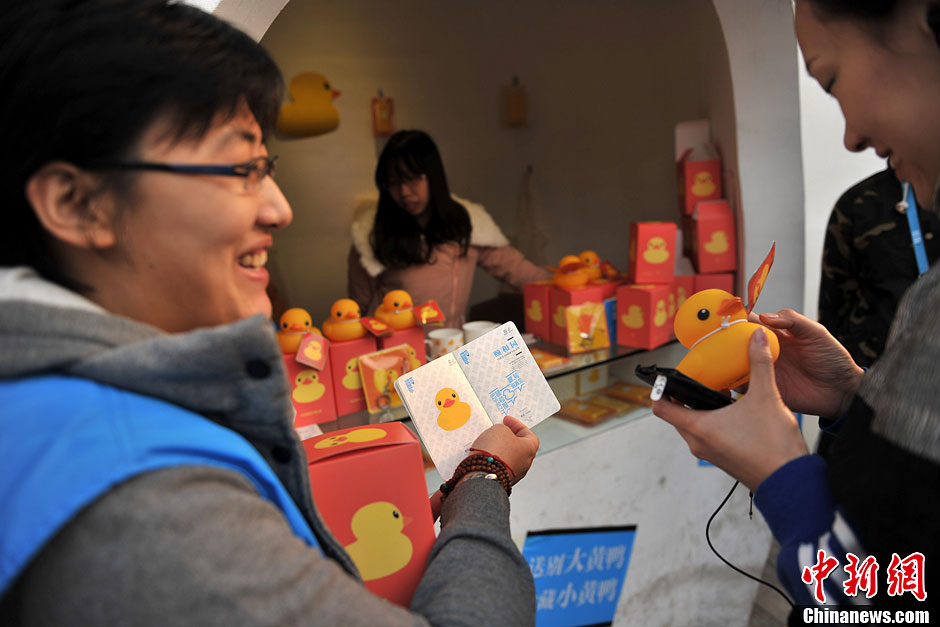 10月27日,北京颐和园岸边人头攒动、观者如潮,不少游客全家出动前来合影留念,跟“鸭”说再见。当日,大黄鸭将结束北京之旅,踏上新旅途。颐和园昆明湖上游船穿梭,中外游客纷纷在“大黄鸭”即将告别京城之时前来观赏拍照。图为大黄鸭纪念品专卖处出售的大黄鸭与纪念护照。中新网记者 金硕 摄