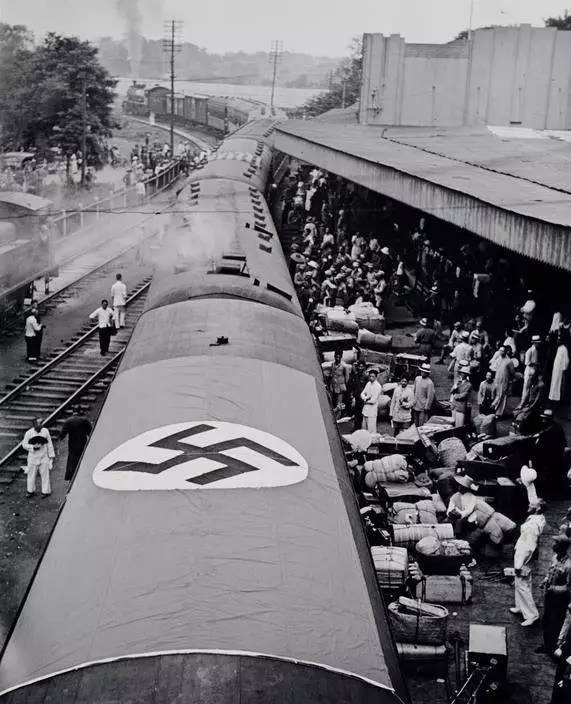 ▲1938年7月5日,武汉,蒋介石聘请的德国军事顾问乘火车离开中国。为避开空袭,火车车厢上覆盖了一面巨大的纳粹旗帜。抗战前,中国一直接受德国的军事援助,但后来德国与日本结盟。抗战爆发后,日本一直要求德国撤回军事顾问,称:“此次事变名为中日之战,实为日本人与德国打仗。”