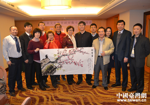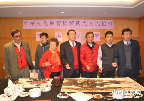 中国台湾网2月13日台北消息 2月12日,应中华海峡两岸企业交流协会邀请,来台出席第三届高雄灯会节暨北京特色周活动的大陆书画名家与台湾知名书画家在台北举行交流笔会。台湾中华文耀文教经贸交流协会理事长、台湾画家吕玉环主持笔会,程茂全、张和平、王兴家、慕云五等与台湾画院副院长卢锡炯合作献艺,共叙友情贺新春。(中国台湾网北京通讯员 郭宁 王正智)