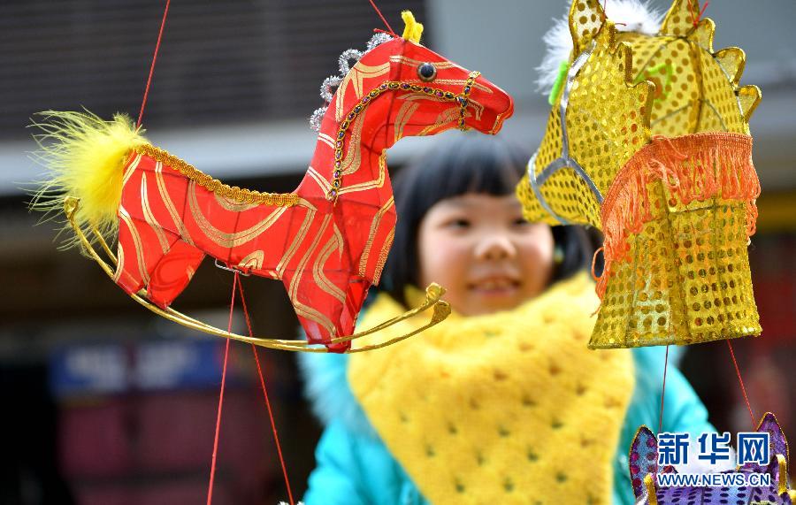 2月10日,一名小朋友在江苏镇江花灯市场挑选传统手工“小马灯”。 随着元宵节临近,江苏省镇江市花灯市场的各式花灯迎来销售旺季。新华社发(封疆江 摄)