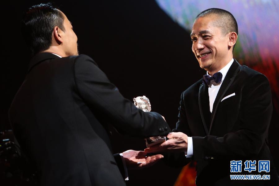 2月15日,在德国柏林,演员廖凡(左)从梁朝伟手中接过“银熊奖”。当日,第64届柏林电影节各奖项揭晓,影片《白日焰火》主演廖凡获电影节最佳男演员“银熊奖”。 新华社记者张帆摄