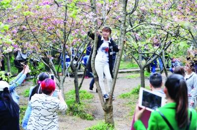 武汉大学情人坡,一年轻女孩爬到树上拍照。记者李子云 摄